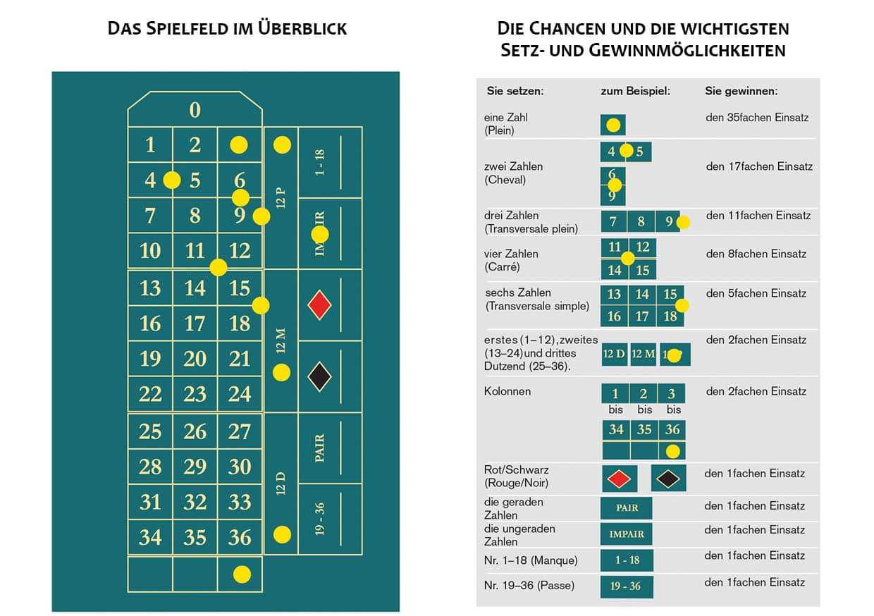 Mit der Aufforderung „Bitte das Spiel zu machen“ eröffnet der Croupier das Spiel. Sie setzen nun auf die Zahlen oder Chancen (z.B. Rot oder Ungerade) Ihrer Wahl. Bis zur Absage „Nichts geht mehr“ kann gesetzt werden.